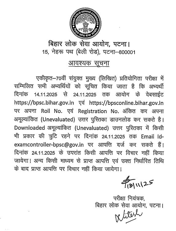 अभ्यर्थियों को सलाह दी जाती है कि वे 24 नवम्बर 2025 से पहले अपनी अमूल्यांकित उत्तर पुस्तिकाएँ डाउनलोड करें और आवश्यक होने पर आपत्तियाँ दर्ज करें।
